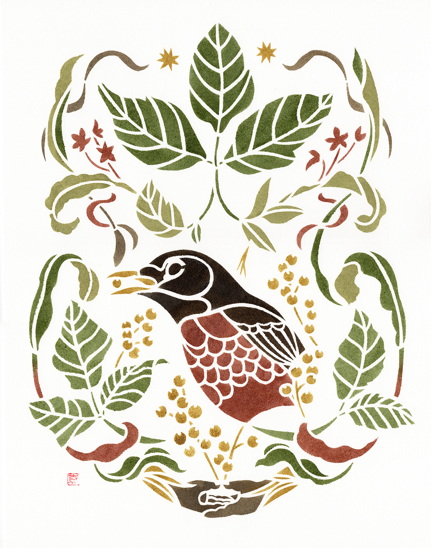 This piece above was stencil printed with pigments from Oriental Bittersweet branches (pink) and berries (light orange), Common Buckthorn berries (green), and roots of Toringo Crab Apple (light yellow). It’s a batch that came out pale, so I decided to paint them on a dark background and see what happens. It turned out to be tricky. When I painted, the pigments became invisible for a few minutes. Then some parts began to show their brightness, while others remained invisible. I was completely puzzled by this, tried it on a couple more pieces of paper, and they kept behaving oddly. In the end, I thought this experiment was a failure. (I should have taken a picture then.)
